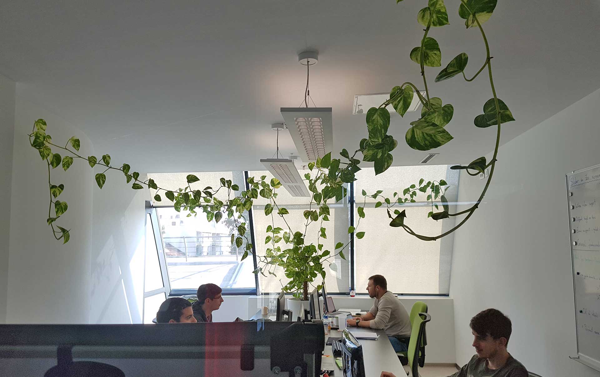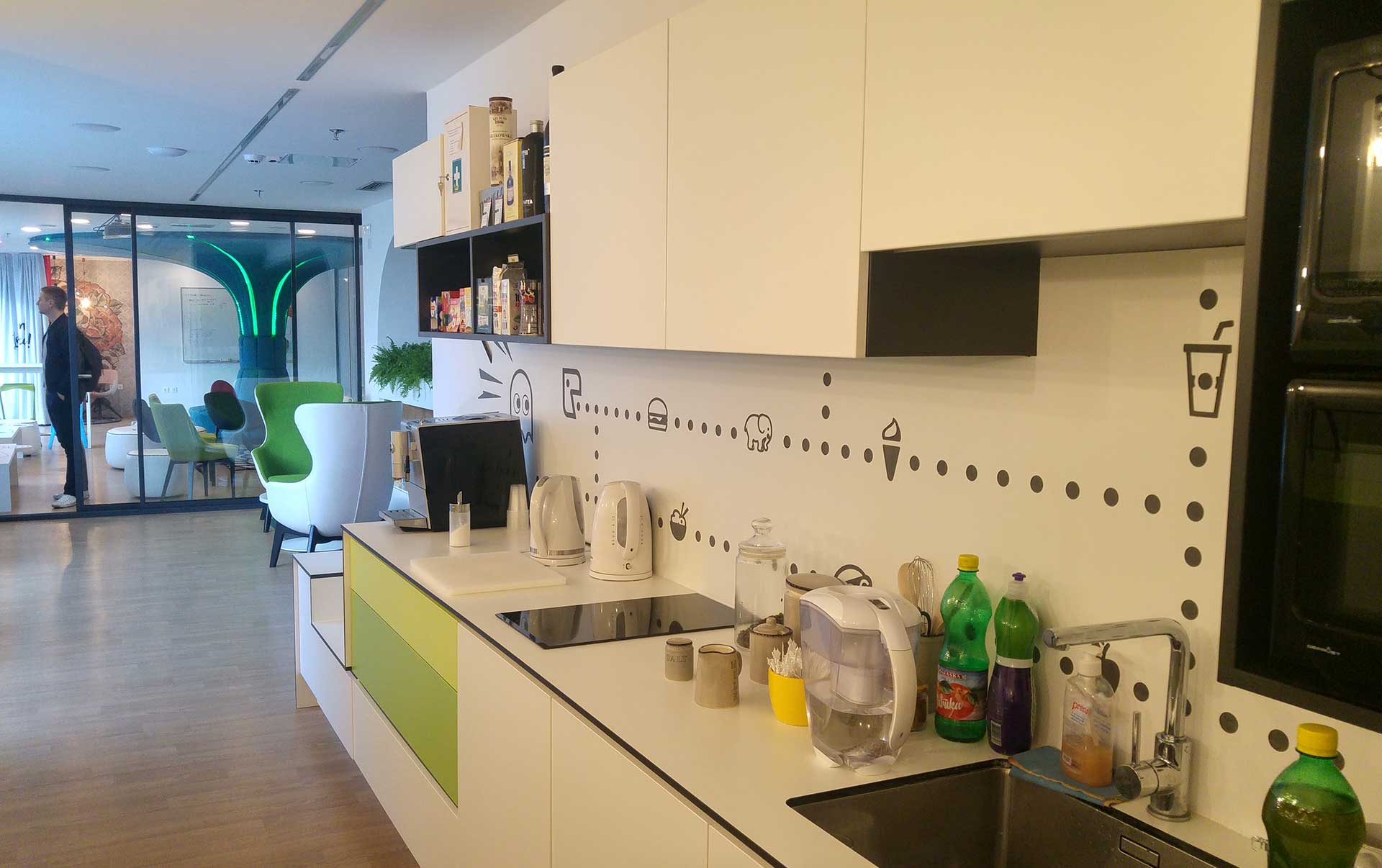 Enormous windows make sure that the office is bright and they offer a view on the terrace, while the glass wall offers the view of the hallway. There are six people in each office. Closed offices guarantee greater concentration and less distractions that could potentially disrupt the work. There is a calming quietness with soft music playing in the background. Another characteristic of their offices is that they are named after smaller cities from all around the world. One of the empty offices was even named “Škofja Loka” for a while, which we thought was extremely cool.