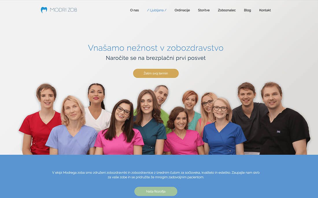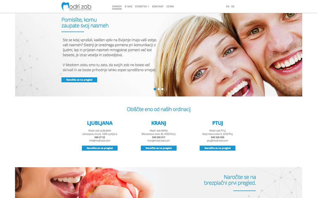 A client that also decided on redesigning their website was the dental practice Modri zob. The company has its practices in Kranj, Ljubljana and Ptuj and they differ from their competition by being extremely sympathetic and having a strong sense for quality and relaxation. The goal of the redesign was to highlight the above-mentioned advantages, which were not very visible on the previous website. The new website therefore includes numerous animations, illustrations and icons.