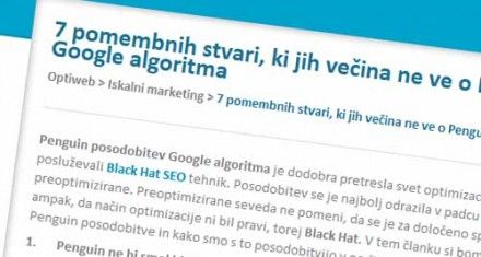 Penguin posodobitev Google algoritma je dodobra pretresla svet optimizacije spletnih strani, še posebno tiste, ki so se posluževali Black Hat SEO tehnik. Posodobitev se je najbolj odrazila v padcu pozicij spletnih strani, ki so bile preoptimizirane. Preoptimizirane seveda ne pomeni, da se je za določeno spletno stran delalo preveč optimizacije ampak, da način optimizacije ni bil pravi, torej Black Hat. V tem članku si bomo pogledali nekaj glavnih značilnosti Penguin posodobitve in kako smo s to posodobitvijo v podjetju Optiweb pridobili.