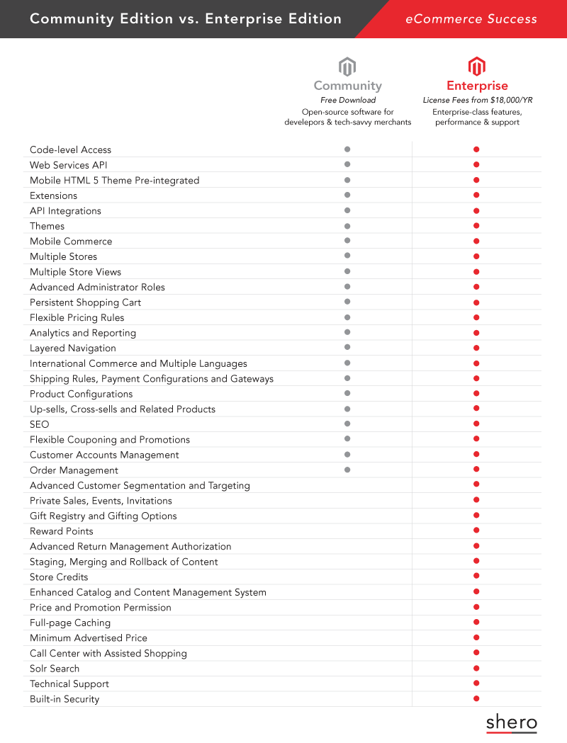 Magento platforma je zaradi open-source skupnosti napredovala do verzije, ki je zanimiva tudi večjim enterprise podjetjem. Tudi Tero Juola, ki ima 19 let izkušenj na ecommerce področju ter praktične izkušnje na Magento, WebSphere Commerce ter Hybris namestitvah, pravi, da Magento ponuja najhitrejšo pot do splavitve trgovine, najmanjši strošek razvoja ter najhitrejši ROI od vseh Enterprise platform.