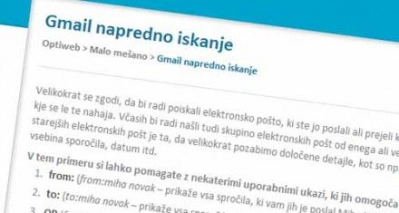 - in:anywhere (from:miha novak in:anywhere – prikaže vsa sporočila, ki vam jih je poslal Miha Novak, tudi tista, ki so v košu in med nezaželjeno pošto)