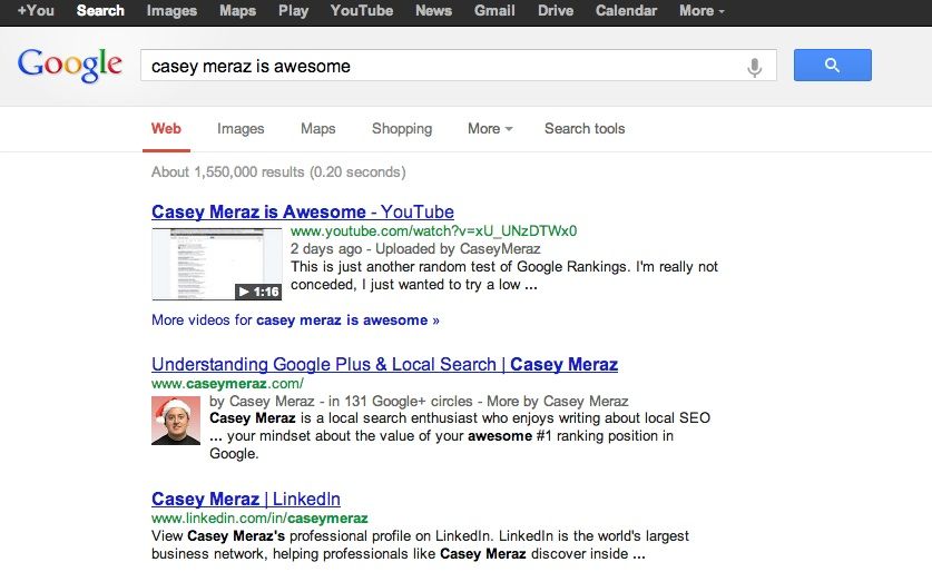Casey Meraz je v raziskavi, ki jo je izvedel leta 2013 dokazal, da ima tudi omenjena klepetalnica velik vpliv na pozicijo iskalnih rezultatov. Ustvaril je spletno stran s svojim imenom, ki ni imela praktično nič konkurence in je zasedala prvo mesto na iskalnikih, nato je na portal YouTube prenesel video, sestavil opis in ga objavil ter delil na G+ Hangouts. Njegova povezava je bila poindeksirana v roku ene minute in že takoj dosegla 9. mesto na iskalnikih. Čez 24 ur pa je bil ta video že na prvem mestu brez kakršnegakoli link buildinga.