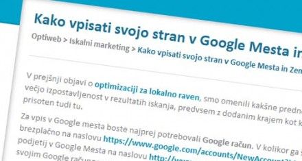 V prejšnji objavi o optimizaciji za lokalno raven, smo omenili kakšne prednosti lahko prinese vpis v Google Mesta. Za večjo izpostavljenost v rezultatih iskanja, predvsem z dodanim krajem kot ključno besedo, se vsekakor izplača biti prisoten tudi tu.