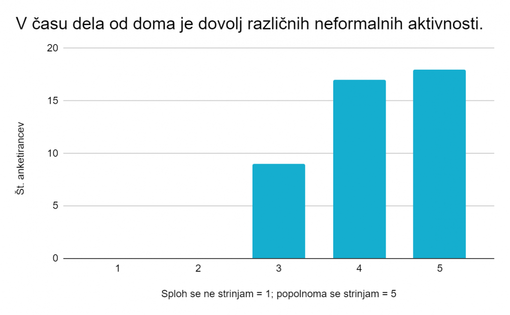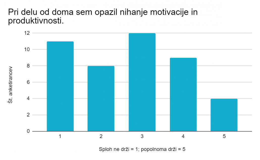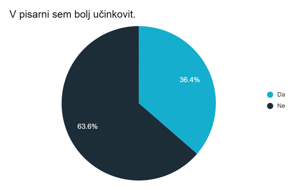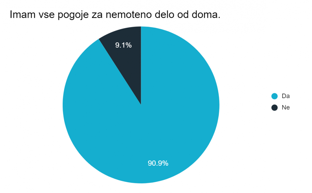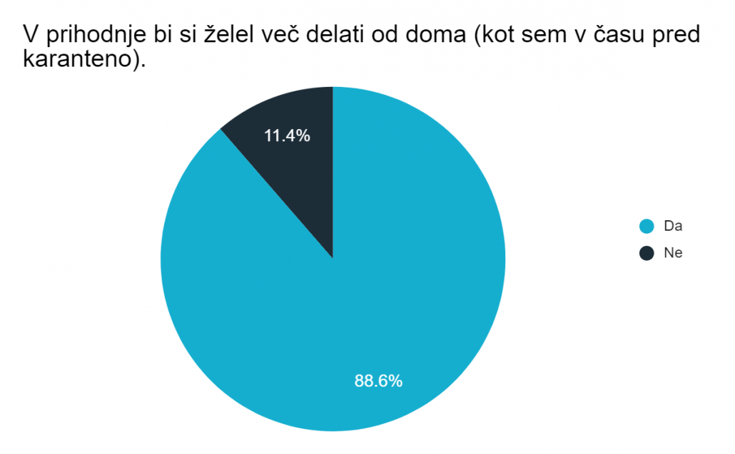To je eden tistih trenutkov, ko se še bolj zaveš, kako pomembno je vlagati v svoje čudovite sodelavce! Nekaj zaposlenih je delo od doma prakticiralo že pred trenutno situacijo, večina pa je sedaj videla, da delo od doma lahko poteka gladko in enako uspešno. Najbolj je presenetilo to, kako hitro in uspešno smo se uspeli prilagoditi precej težavni situaciji. Praktično čez noč smo vzpostavili, da delo od doma poteka brez težav in je situaciji navkljub enako dobro opravljeno. Kar 98% zaposlenih po svetu si po trenutni situaciji želi vsaj del delovnega časa delati od doma*. Podobno se je zgodilo tudi pri nas, kar je lepo razvidno iz spodnjega grafa.