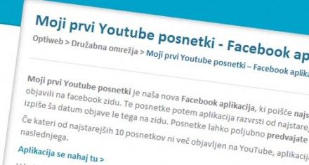 Moji prvi Youtube posnetki je naša nova Facebook aplikacija, ki poišče najstarejših 10 video posnetkov, ki ste jih objavili na facebook zidu. Te posnetke potem aplikacija razvrsti od najstarejšega navzdol, poleg vsakega posnetka pa izpiše ša datum objave le tega na zidu. Posnetke lahko poljubno predvajate v vključenem predvajalniku.
