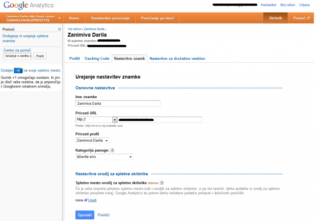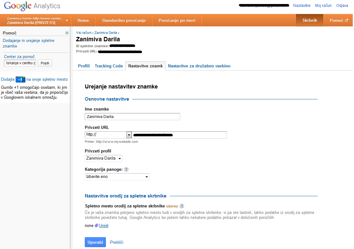 - V orodju GA v zgornjem meniju kliknete na ‘Skrbnik’ in izberete ‘Nastavitve znamk’