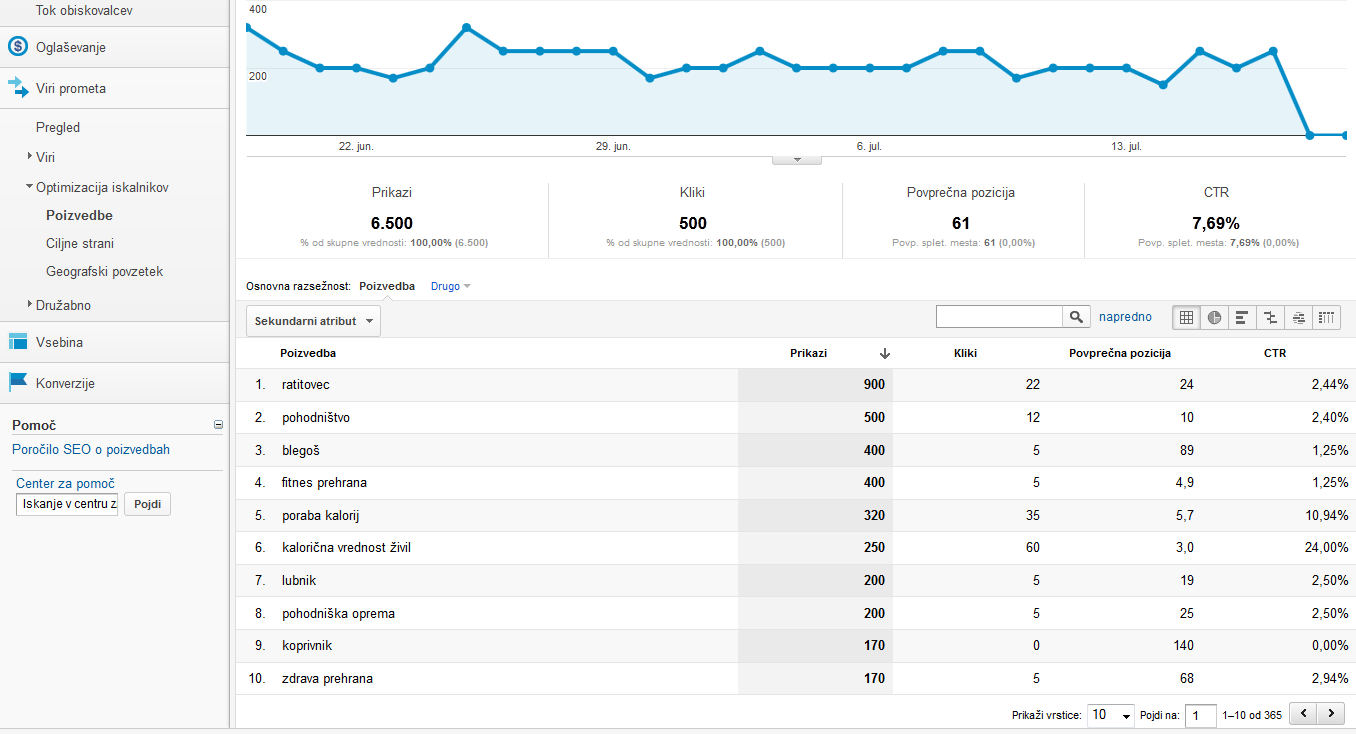 Kot smo že omenili so podatki o vseh poizvedbah na voljo v orodju GWT (Google Webmaster Tools), kjer lahko vidite ključne besede, število klikov, povprečno SERP pozicijo in landing page.