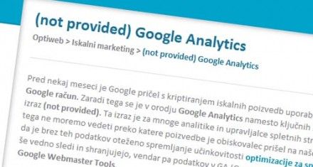 Pred nekaj meseci je Google pričel s kriptiranjem iskalnih poizvedb uporabnikov, ki so med iskanjem prijavljeni v svoj Google račun. Zaradi tega se je v orodju Google Analytics namesto ključnih besed oz. iskalnih poizvedb začel pojavljati izraz (not provided). Ta izraz je za mnoge analitike in upravljalce spletnih strani postal zelo nadležen, saj na podlagi le tega ne moremo vedeti preko katere poizvedbe je obiskovalec prišel na našo spletno stran. Še največji problem ja ta, da je brez teh podatkov oteženo spremljanje učinkovitosti optimizacije za spletne iskalnike. Google sicer te poizvedbe še vedno sledi in shranjujejo, vendar pa podatkov v GA (Google Analytics) ne prikazuje več, so pa zato na voljo v orodju Google Webmaster Tools.