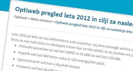 Leto 2012 je bilo za nas defenitivno zelo uspešno, saj smo presegli večino zastavljenih ciljev in tako lahko rečemo da kriza za nas tudi letos ni obstajala (razen kar se tiče plačil, ki so postala res pain in the ass :=)).