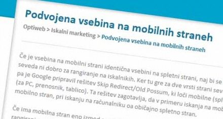 Če je vsebina na mobilni strani identična vsebini na spletni strani, naj bi se to upoštevalo kot podvojena vsebina, kar pa seveda ni dobro za rangiranje na iskalnikih. Ker tu gre za dve vrsti strani seveda to ne bi smela podvojena vsebina, zato pa je Google pripravil rešitev Skip Redirect/Old Possum, ki loči mobilne (spletne strani za mobilnike) in spletne strani (za PC, prenosnik, tablico). Ta rešitev zagotavlja, da v primeru iskanja na mobilni napravi spletni iskalnik Google najde mobilno stran, pri iskanju na računalniku oa običajno spletno stran.