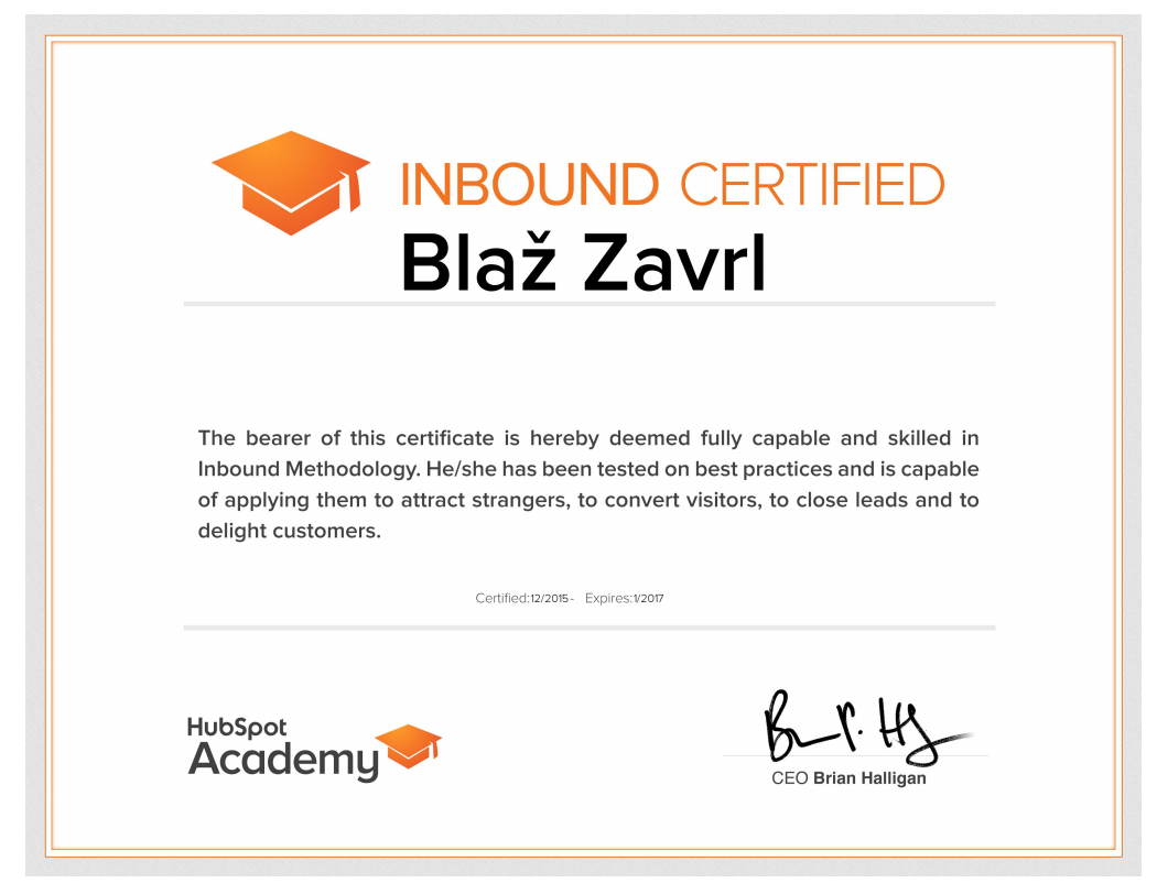 Blaž Zavrl je naredil HubSpot Inbound marketing certifikat, ki potrjuje, da Blaž obvlada celotni marketing proces. Torej, kako privabiti stranke oziroma vzbuditi njihovo pozornost, preusmeriti obiskovalce v kontakte in zaključiti posel. Za konec pa, kako vse skupaj narediti v TOP kakovosti, ki poskrbi, da obstoječe stranke postanejo promotorji podjetja oziroma blagovne znamke.