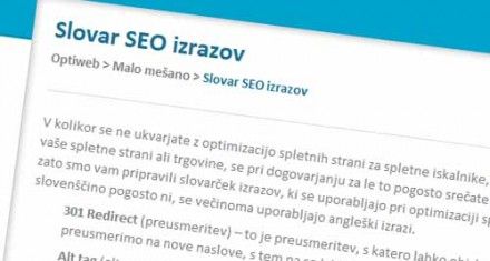 V kolikor se ne ukvarjate z optimizacijo spletnih strani za spletne iskalnike, vendar pa se za zanimate za optimizacijo vaše spletne strani ali trgovine, se pri dogovarjanju za le to pogosto srečate z določenimi izrazi, ki vam niso znani. Prav zato smo vam pripravili slovarček izrazov, ki se uporabljajo pri optimizaciji spletnih strani. Ker ustreznih prevodov v slovenščino pogosto ni, se večinoma uporabljajo angleški izrazi.