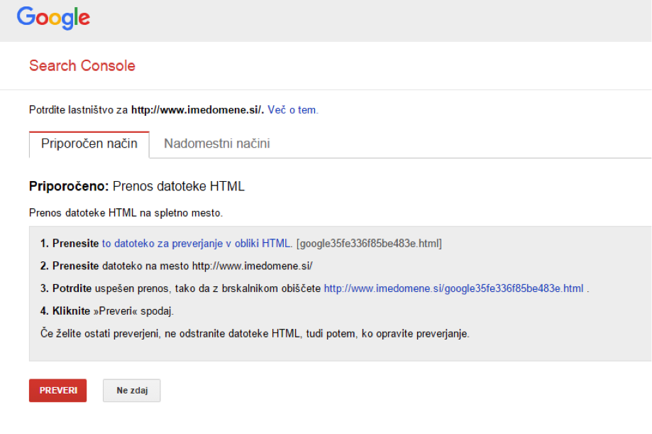 Gre za enostaven proces, lastništvo vaše spletne strani pa lahko potrdite na več načinov. Priporočen in najenostavnejši način je prenos datoteke HTML.