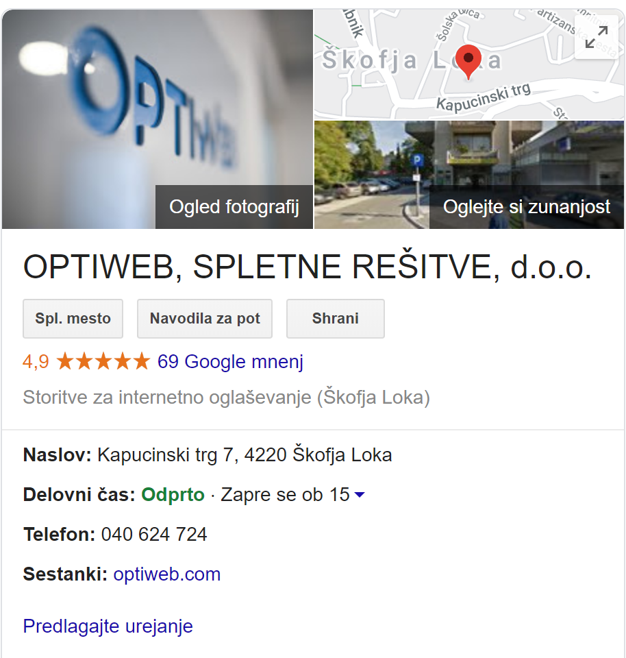 Za razliko od spletnega oglaševanja rezultati spletne optimizacije niso vidni takoj, saj se učinki kažejo na daljši rok. A to še zdaleč ni pomanjkljivost! Danes, jutri in pojutrišnjem bo dela ali naročil za marsikoga še dovolj, a že čez nekaj tednov ali mesecev se utegne število povpraševanj znižati. Če danes zavihate rokave, boste zato učinkovito poskrbeli za prihodnost svojega podjetja, saj se boste med prve zadetke prebili ravno, ko boste to najbolj potrebovali.