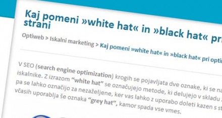 V SEO (search engine optimization) krogih se pojavljata dve oznake, ki se nanašata na tehnike optimizacije za spletne iskalnike. Z izrazom “white hat” se označujejo metode, ki delujejo v skladu z priporočili iskalnikov, “black hat” metode pa se lahko označijo za nezaželjene, ker vas lahko z uporabo doleti kazen s strani iskalnika. Ker ni vse črno – belo se včasih uporablja še oznaka “grey hat”, kamor spada vse vmes.