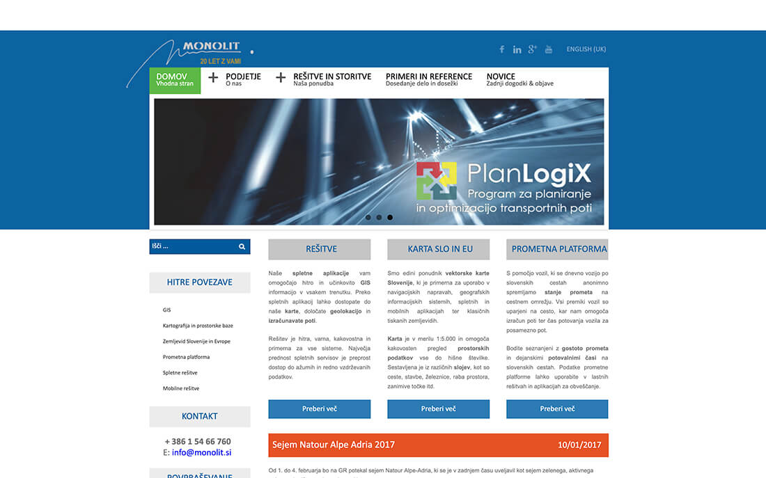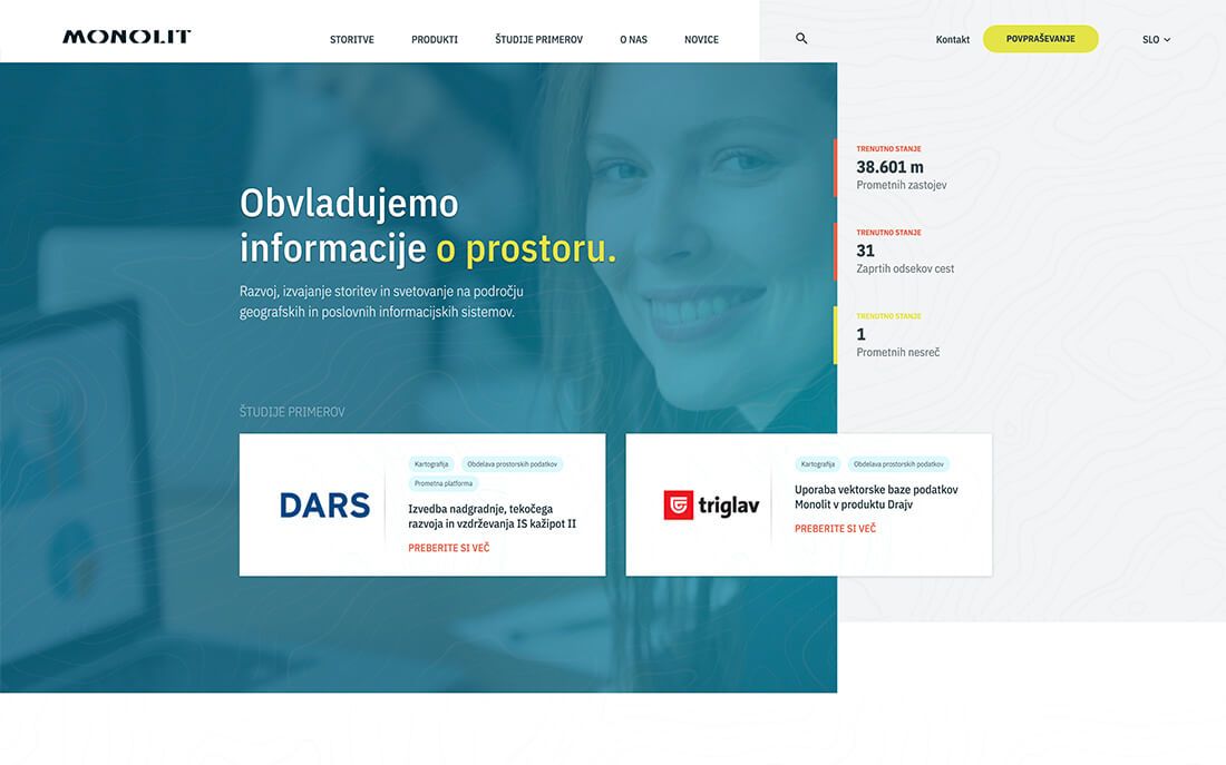Na Monolitovi novi spletni strani lahko tako kadarkoli preverite trenutno stanje na slovenskih cestah, izveste kaj novega o izbranih planinskih poteh na območju Slovenije ali si ogledate, kako poteka izračun optimalne poti med dvema točkama.